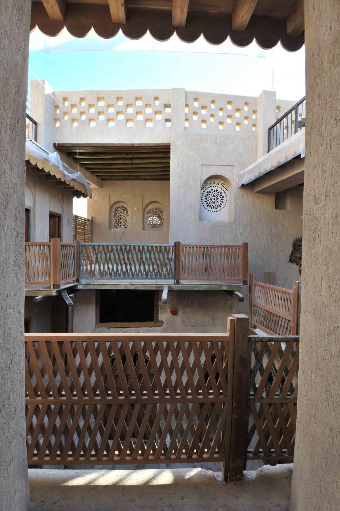 The plan of the house is almost typical of that of any traditional house of the same era, with most of the rooms on the ground floor. An open courtyard centered in the middle of the house was the main focal point and everything either leads to it or has access from it. A large liwan with traditional openings, located on the west and south side of the upper floor, is enclosing the space. Most of the openings in the house have traditional rectangular proportions with wooden panels, except in some areas where a half arch is found above some of the windows. These types of openings do not exist in traditional houses in the UAE but are found in houses in Syria, Lebanon and Palestine. This detail was probably imported by Al-Aqaili as a result of his travels. Some of these wooden panels like linear strips are found on the ground floor. Decorations are mostly found on the corner of the walls close to the door with geometric patterns. Al-Aqaili was a skillful calligrapher, and some of the panels decorated with carbon calligraphy found in the sleeping rooms on the ground floor were made by him.