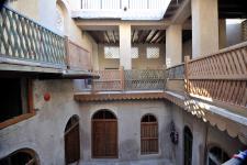 The house has two entrances, both connected by a small street to the open public space of Suq Al-Arsa. Geometric decoration is found above its main wooden door. The main entrance has an indirect approach and is connected with two majlis on both sides. It leads to a relatively open courtyard in the middle of the house and all rooms are clustered around it on all four sides.