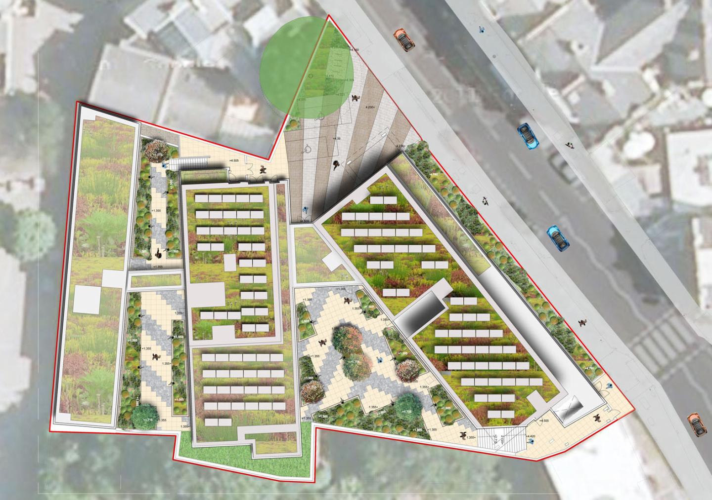 The three spaces have been designed to be visually pleasing when viewed from above whilst providing the necessary access routes through the scheme. The two lower ground floor courtyards have been designed as spaces for the students to inhabit and relax. Seating has been proposed and a variety of spaces have been created with proposed planting and small trees.