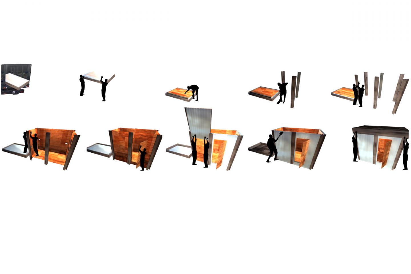 TESU is a small but versatile structure composed of portable walls, a floor and a roof. The walls have fold down furniture modules which allow the same space to operate as a place to work and eat during the day and a place to fold down a storable bed for sleep at night. The outer skin of the structure is cellular polycarbonate which can be filled with native material such as soil, leaves, snow or water to provide insulation to the unit. The roof is a waterproof membrane with a built in photovoltaic module to provide a small amount of energy.