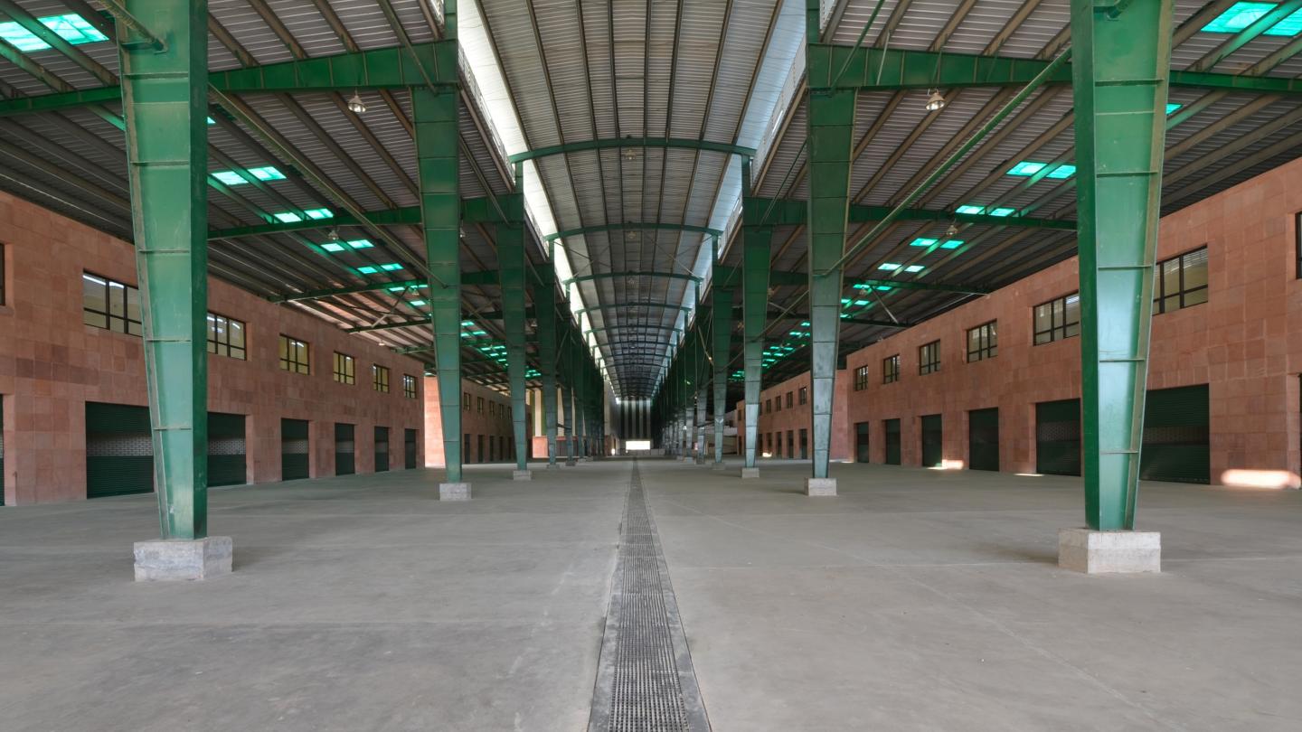 The T-shaped main market block comprises mainly three wings. The larger flange of the T accommodates 34 wholesale shops. These shops are double storied and each shop has a size of 16-0”x38-0”. A 3-metre wide unloading platform has been provided on the outside of the shops that is towards the parking lot. On the inner side, a 40-feet deep display platform has been provided in front of each shop. Two rows of display platform on both sides together with 30 feet wide circulation spine in between has been covered from top in the form of an atrium.