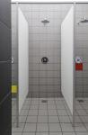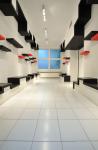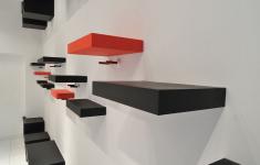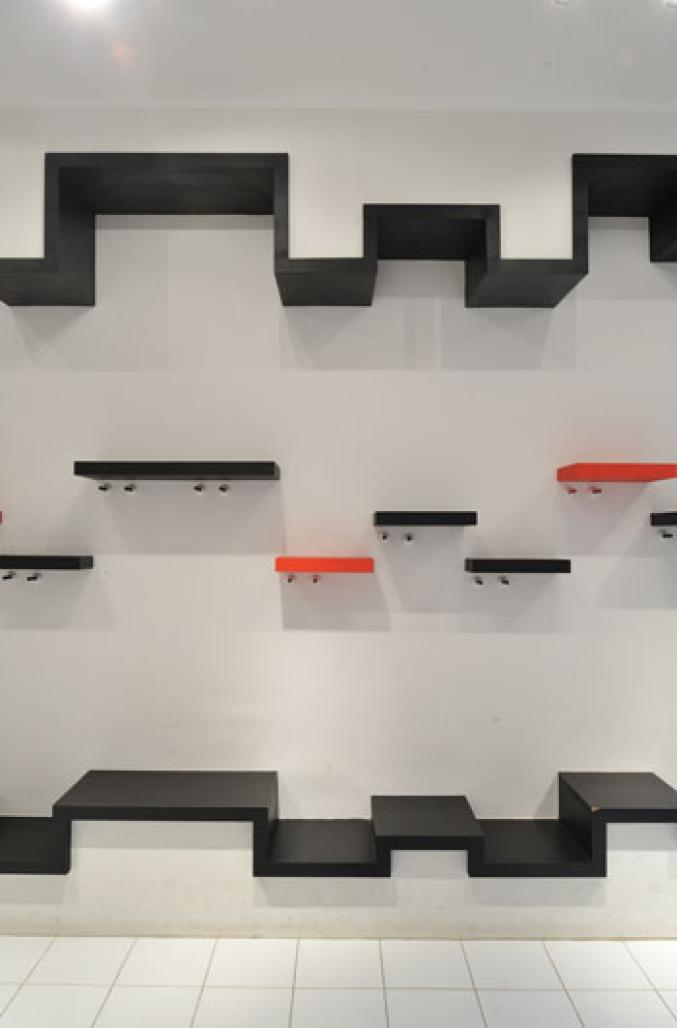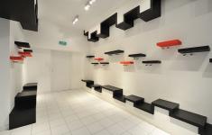 The subject of work was gym changing rooms redesign in primary school. A starting point of project was variety of kids age at the school. This is why the benches of variable height were designed . The same theme of contrast band has been used on the ceiling. The shelves and clothes hangers randomly coloured red make the work complete.