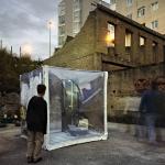 The 2x2x2m dwelling is composed of an unfoldable aluminium structure. The very box used to carry this structure can be used as a piece of furniture that supplies three elements usually considered basic denominators of our idea of a house – the cook, the sink, and the lighting. Complementarily, accessories such as an external shower or a chemical toilet could be added for longer uses of the dwelling.