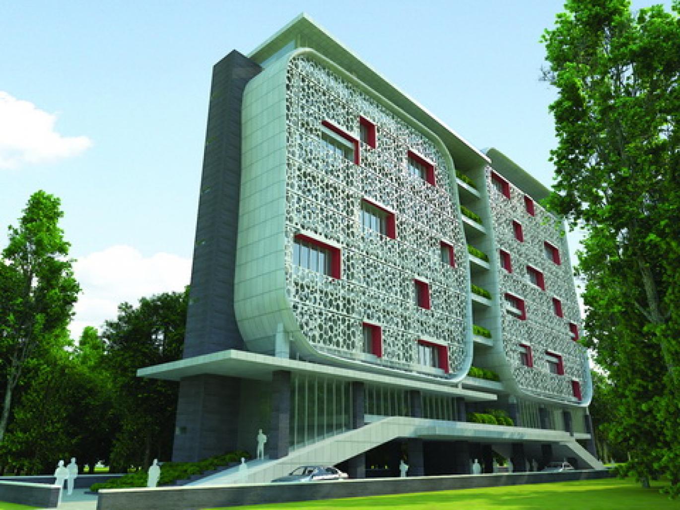 The building takes the form of a metaphor of a wedge of bone. Cavities are used as suns shading to filter the sunlight that may become overheat inside, so the use of air conditioning can be reduced. The building forms a thin horizontal line balanced. East and west sides of the facade made massive using ACP to reflect the suns heat. To conserve water usage and water waste from sinks and showers is collected and distributed to the tank for the closet and landscape.
