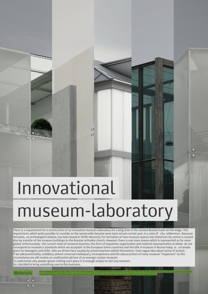 There is a requirement for a construction of an innovative museum-laboratory for a long time in the ancient Russian town on the Volga. This requirement, which quite possible to consider as the social order became even more actual current year, in a view of city millennium (because Yaroslavl, as archeologists believe, has been based in 1010). Necessity for formation of new museum spaces into historical city centre is caused also by transfer of the museum buildings to the Russian orthodox church. However, there is one more reason which is represented as far more global. Unfortunately, the current state of museum business, the form of exposition organization and material representation at whole do not correspond to museum`s standards which are accepted in the European Union countries and the USA. A museum in Russia today is a trample place for teenagers and child, who are driven here usually by school teachers (which themselves have vague idea about sense of action).