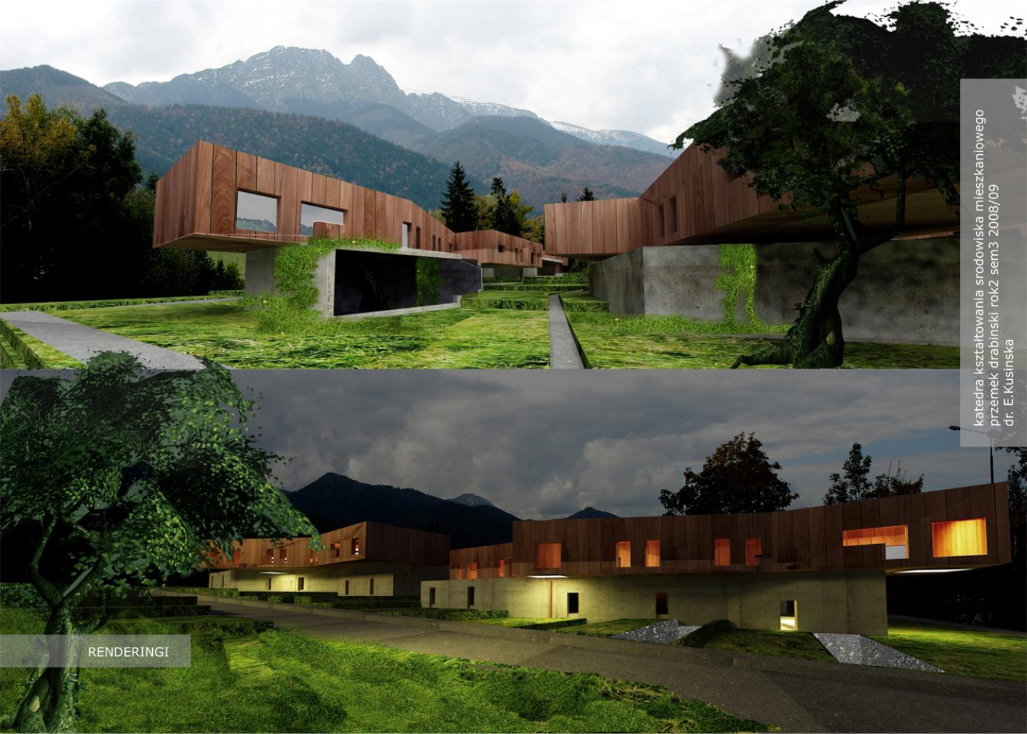 semi-colective houses, that are located in the mountains / zakopane / poland. design intention was to create a group of houses, that are highly connected with the context, and also not literal and borig.