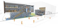 Segregation (Both/And) Integration explores the both/and condition of dualities versus the traditional either/or. A bridging gallery and unifying Cor-ten steel facade integrate segregated community and institute buildings. The gallery creates an uninterrupted plaza that serves both institute and community. Gallery, community and institute spaces integrate at the main stair, which through the use of reclaimed sinker cypress, evokes a front porch condition for the institute, allowing it to be both public and private, rarefied and everyday, segregate and integrated within the community.