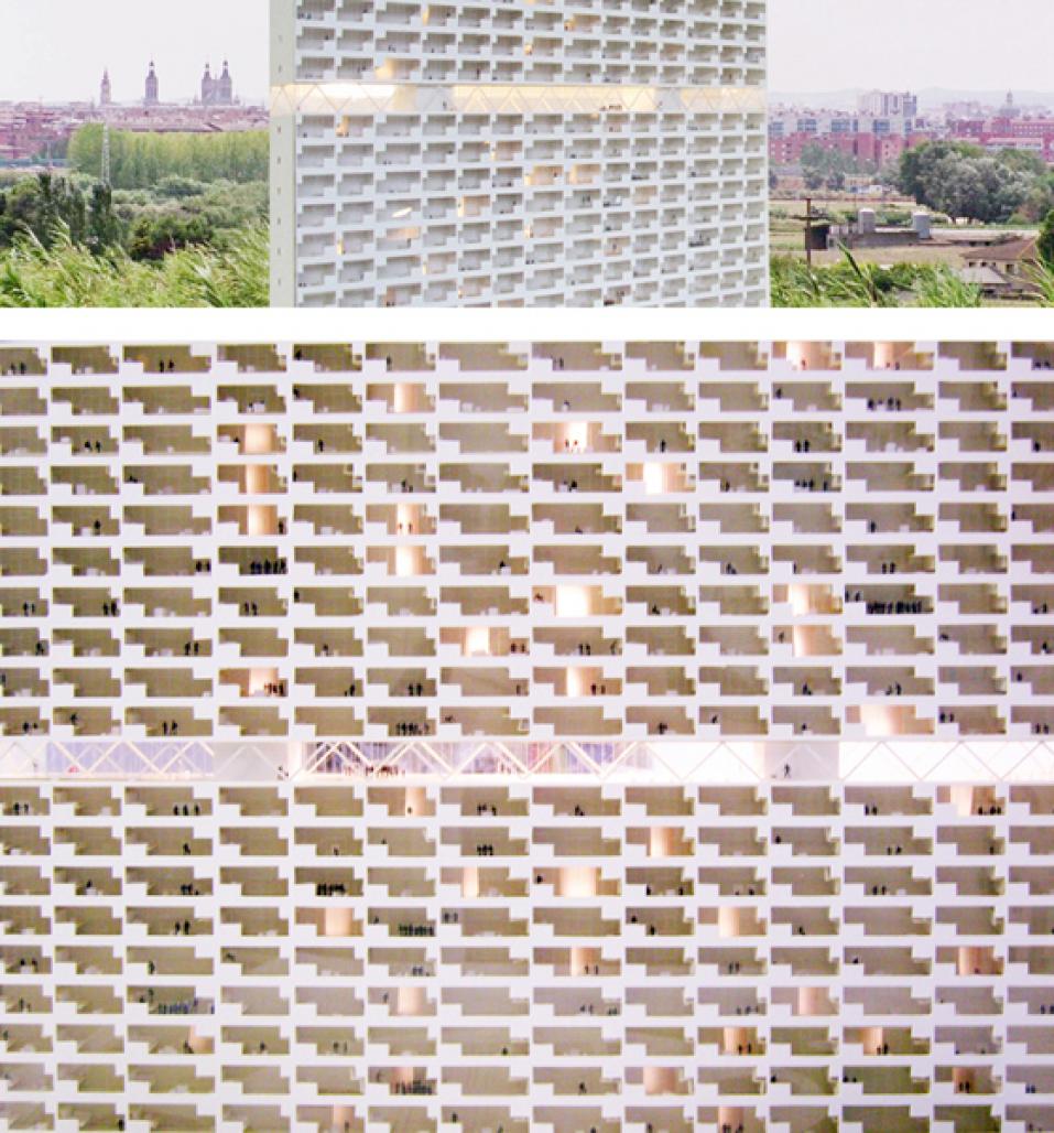 For the project of 500 University apartments at the Zaragoza campus, we choose to organize the dwellings in a single building of 100 meters of height. It will contribute to the current creation of Zaragoza’s skyline. The characteristic section of the units will generate the pattern in the façade of the building.