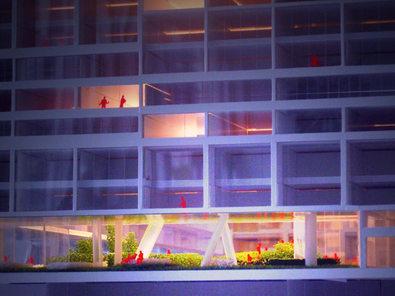 At 45 meters in height the project is visible from the whole area, becoming a reference element for the “garden villages” at the left of the Flora Park. The urban gesture of “Big B” marks the end of the dock and creates a façade for the new park in front of the water.