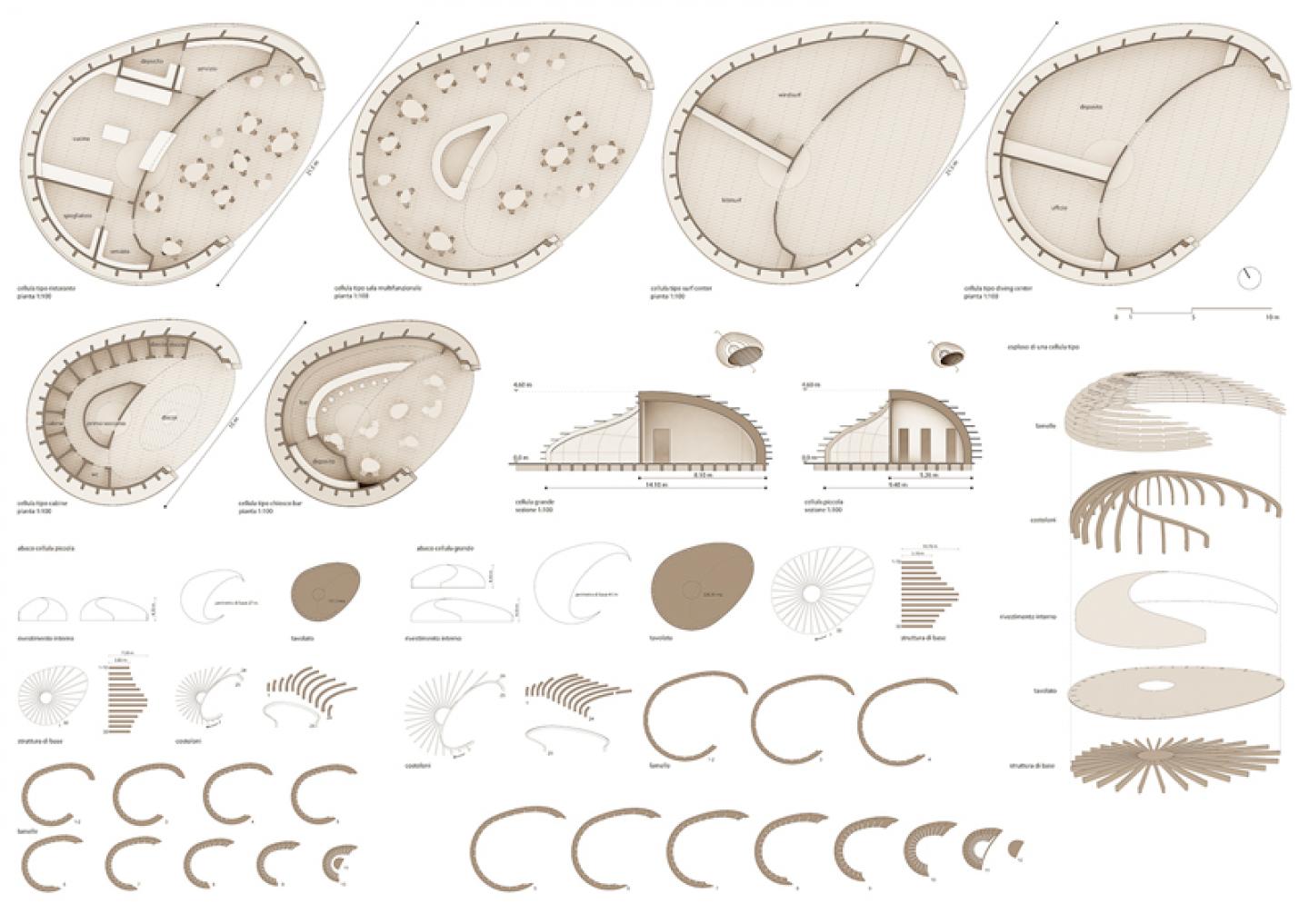 The construction system is based on wooden frames that connect each other creating a series of little igloos. A special “wing” system is conceived as a sand retainer, in order to allow the new structure to be completely covered by sand outside, being hollow inside. These little pavillions can be dismounted during winter time to be re-mounted each season.