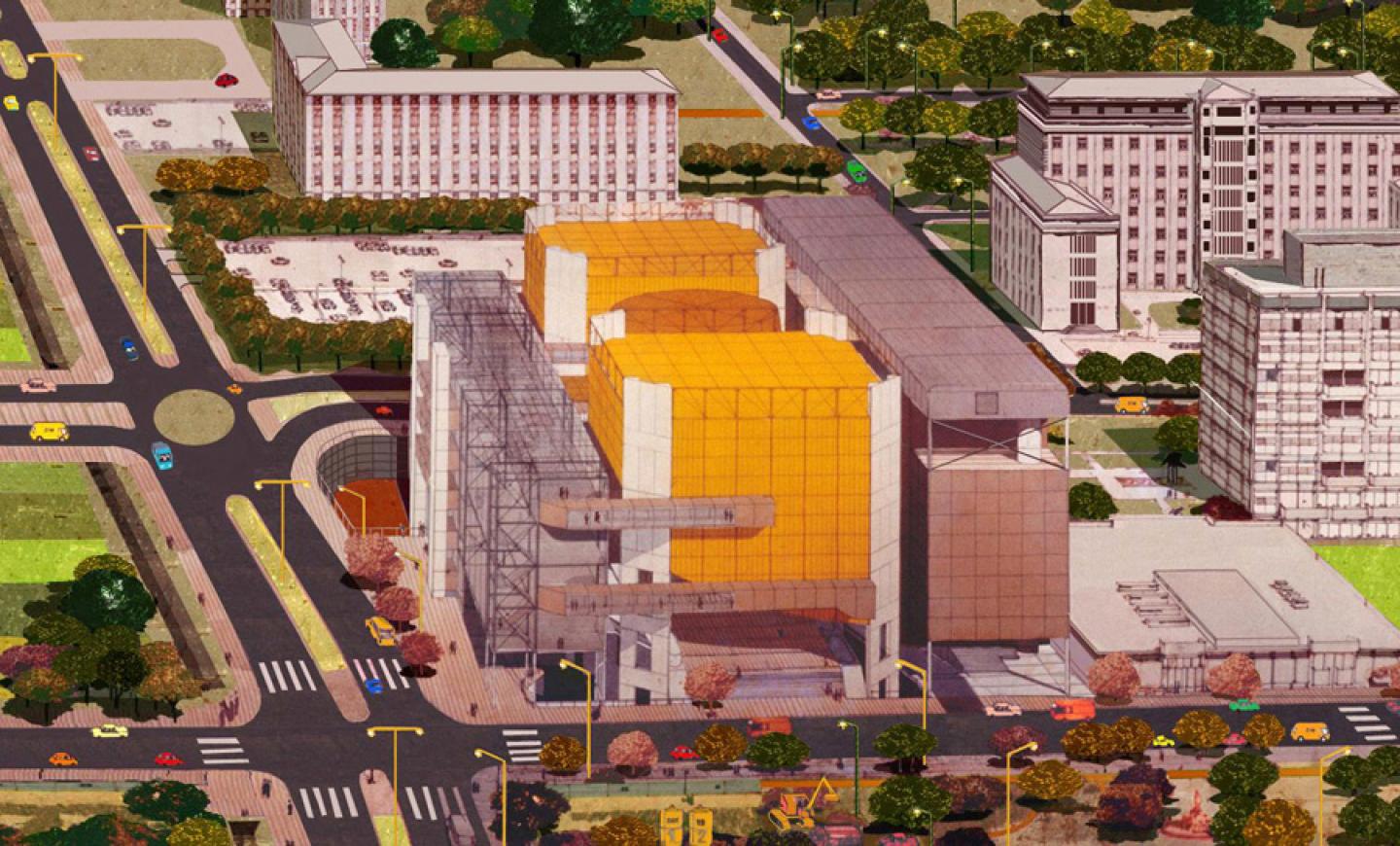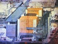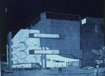 En PB, en la parte central, hay una gran plaza a la que se accede desde las dos calles laterales. Sobre la misma, vuelan suspendidos tres volúmenes, tres salas de teatro de distinto tamaño, cuya estructura independiente del resto facilita la aislación acústica.