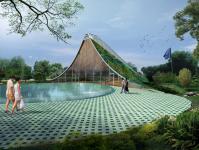 The design of the sales center needs to create uniqueness through its sustainability features: the treatment of the land, the use of materials and the human-comfort of the space. To emphasize even further the sustainable intention of building an Underground Mall, the sales center could also be partially sunken into the park and covered by a green roof as if two “grasslands” are being gently peeled off from the earth. Before entering into the building there is an oval pond in the landscape that leads into an interior water fall then transforms into an underground canal surrounded by lavish greenery into the space.