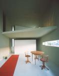 This atelier is a three-storied house. It has a garage, a bathroom, and a workspace on the 1st floor, a kitchen and a dining area on the 2nd floor, and a bedroom on the 3rd floor with a study under the stairway to the roof. All floors are connected with one straight staircase. A long, narrow strip of red stained glass is installed on the south facade of this staircase, letting the symbolic light come during the day. The alcove on the other side is for indirect lighting, giving walls and floors a slight light at night.