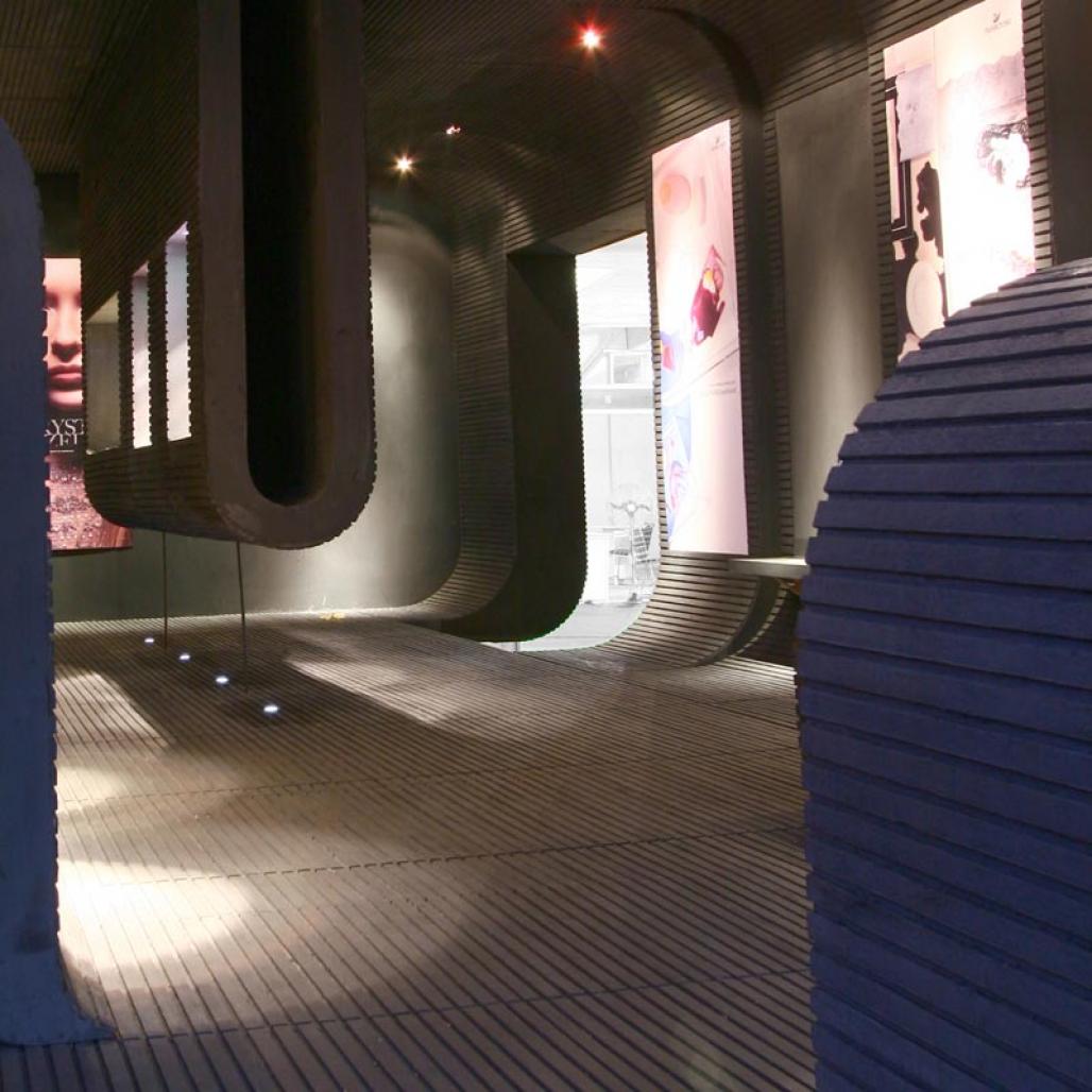 The walls, ceiling and floor merge into one another as surfaces. Kinetic membranes fall and rise to become furniture, dividers and display, punctuated by focused lights and images.