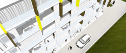 The vertical gardens follow the example of other architectural applications of this living, green façade, such as French botanist Patrick Blanc’s designs, Jean Nouvel’s Musée du Quai Branly in Paris and the recent indoor application in the Harmony Atrium at Lincoln Center in New York, where its purpose is cited as a “theatrical garden,” featuring 20-foot-high walls of plants and cascades of falling water designed by Plantwalldesign / Vertical Gardens Technology, LLC in collaboration with Tod Williams Billie Tsien Architects. Another goal for this project is to integrate and extend the existing greenspace, making sure to give back twofold in green where the built space has been claimed. Contemporary architecture is evolving more and more to minimize its footprint on existing landscapes, where possible. In this sense, even the aforementioned vertical gardens would act as an extension, albeit abstract, to the existing landscape. Both front and back main facades of the building are articulated (patterned) in a grid of large balconies where the sunlight is regulated by adjustable, brise-soleil sliding panels. As each resident adjusts his own brise-soleil in response to light needs or preference, the result is a continuously changing, random pattern on the facades. Also, the steel frame structure is partially extended in elevation at the roof line in order to accentuate the height of the building, without adding to it in volume.