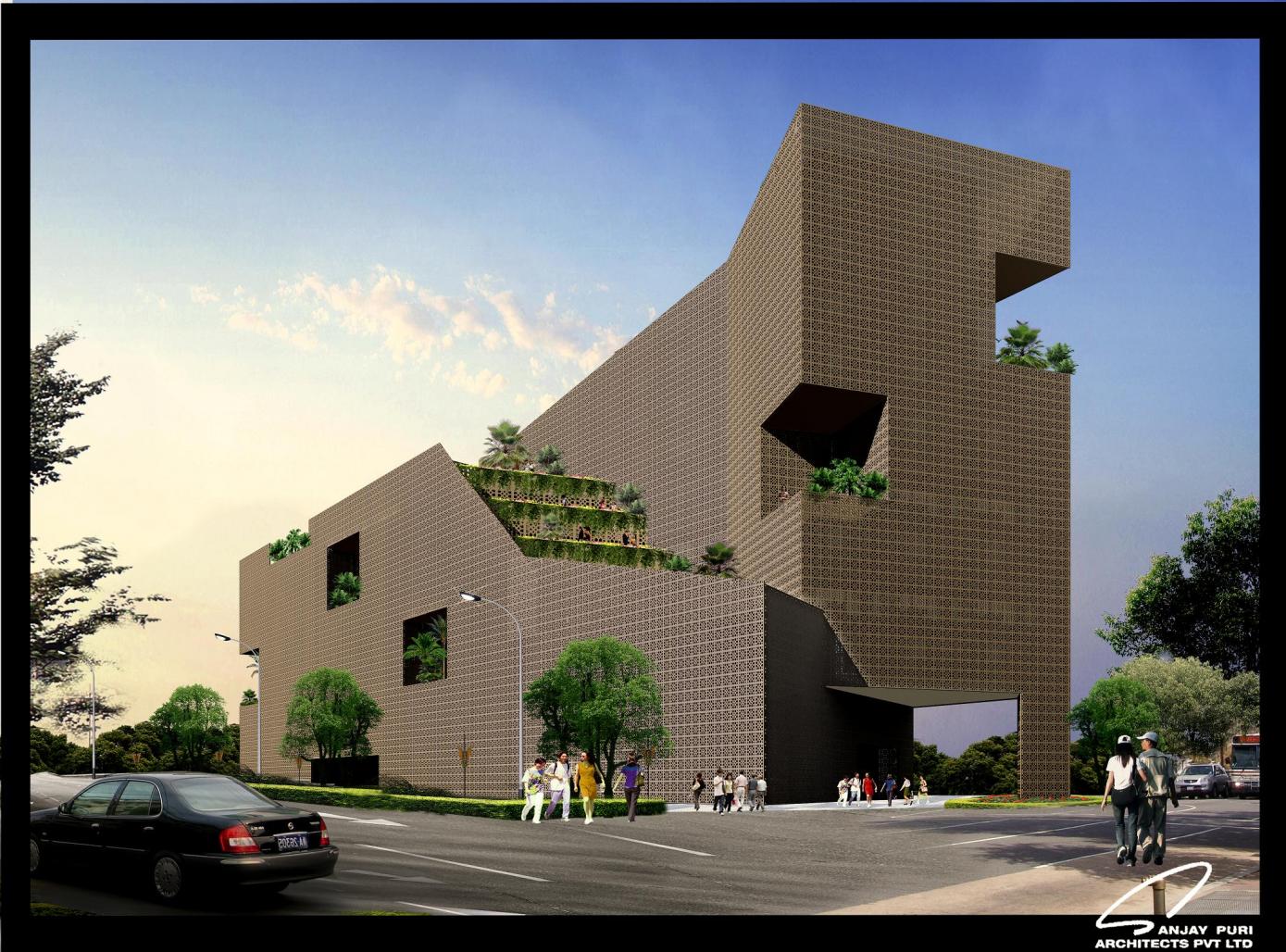 THIS HOTEL IS DESIGNED IN RESPONSE TO ITS LOCATION AND THE CLIMATE OF THE REGION.THE BUILDING IS A SCULPTED RECTILINEAR FORM CREATING TERRACES FACING THE NORTH AND IS SHEATHED IN A JALI SKIN COMPLETELY.THIS JALI IS DERIVED FROM TRADITIONAL INDIAN ARCHITECTURE AND YET IS USED TO CREATE A MODERN BUILDING RELEVANT TO THE PRESENT. THE JALI CREATES PRIVACY FOR THE ROOMS AND PUBLIC SPACES SINCE THE SITE IS LOCATED IN AN INDUSTRIAL AREA. IT ALSO MAKES THE BUILDING MORE ENERGY EFFICIENT BY REDUCING HEAT GAIN DURING SUMMER MONTHS.A JUDICIOUS MIX OF TRADITIONAL AND CONTEMPORARY DESIGNS FORM THE INTERIOR SPACES TOO, CREATING A HOTEL THAT IS UNIQUE IN ITS INTERPRETATION OF TRADITION IN TODAYS’ TIME