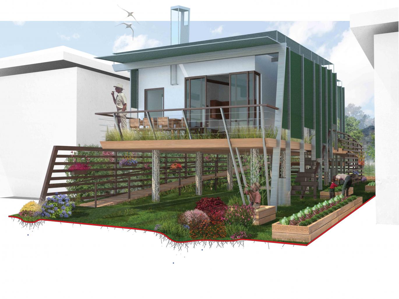 the developed solution functions as an asset to the community. for instance, the neighboring buildings’ energy use is reduced by 5-15% in the summer due to the provision of shade the module provides on neighboring buildings. the geometry of the module and the designed wind wall channels wind between the buildings, increasing occupants of both buildings’ ability to utilize natural ventilation throughout the summer. elderly residents, who are typically detached and segregated from communities once they retire in senior citizen communities and retirement homes, can enjoy an array of benefits from this concept. large porch spaces, shaded ground levels, and potentially community gardens provide opportunities for intergenerational social interaction. senior citizens can allow neighbors to aid in gardening on their lot, providing the opportunity for neighbors to interact socially and potentially for residents to teach neighborhood kids and families how to garden. if residents are unable or uninterested in gardening themselves, they can allow neighbors to garden their raised beds, while retaining some of the produce for themselves and/or sharing in the profits of the sale of their harvests, thereby benefiting both parties economically and socially. at the community scale, neighborhoods can become agriculturally self sustaining by allowing some of these gardens to be public or for the produce to be shared. each lot can generate enough vegetables to feed 13 people throughout the harvest season and enough fruit for 8 people. individual lots can produce a specific set of fruits and vegetables so the community as a whole has a wider array of local food types, as well as a surplus that can be sold for profit, positively contributing to the community’s social and economic well being. thus, this solution helps individuals understand the myriad of benefits of living closely tied to one’s contextual environment and fosters an ded sense of community within the neighborhood while minimizing occupant energy use and reducing living costs through food production for personal consumption and profit, energy and water conservation.