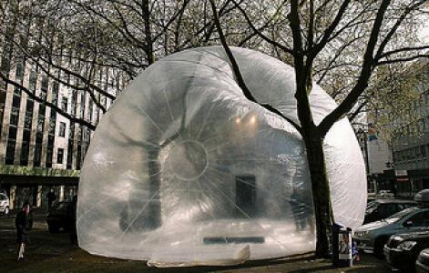 ?Plastique Fantastiques structures affect the space like a soap bubble: with its skin it creates a subject by cropping its contest. The definition of this subject confers him some specific attributes and new possibilities for action. The visitor can experience the bubble by entering it or interacting with it from the outside. The bubble changes completely the perception of the space: its a foreigner which occupies and mutate usual relations and points of view.?By cropping the landscape, it gives birth to a new hybrid environment that allows an osmotic passage between private and public space.