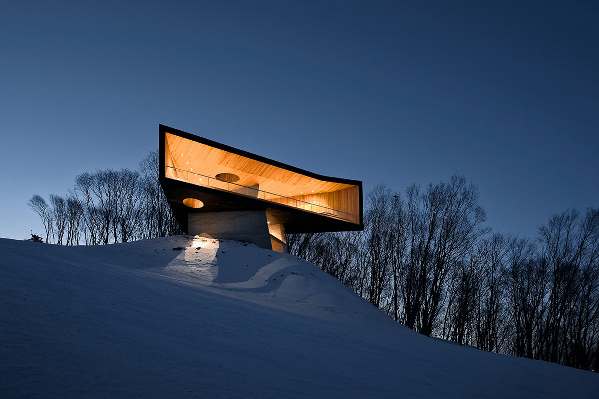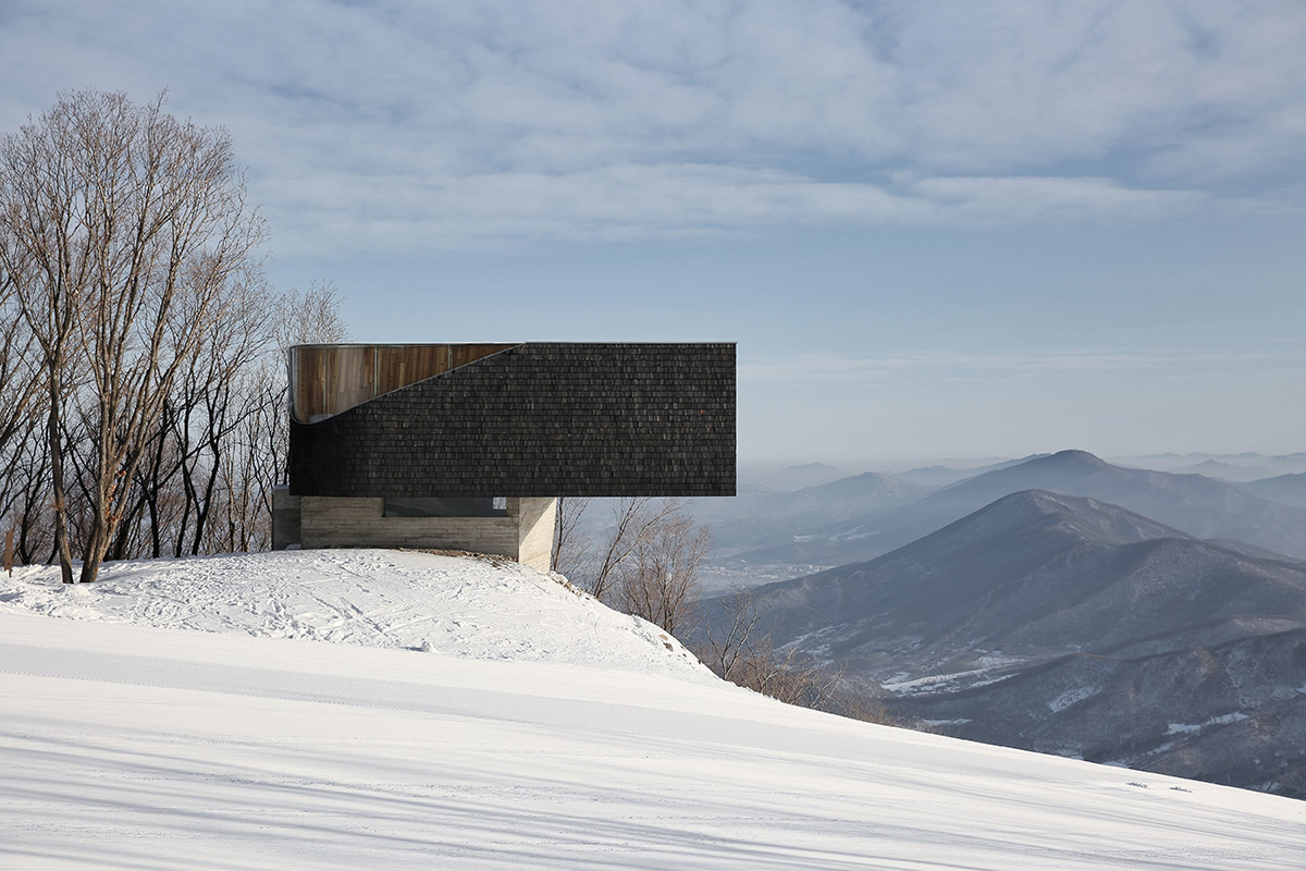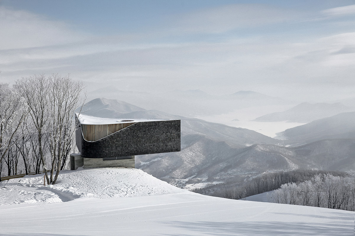 Situated on a hillside between the forest and the slope, the site is surrounded by luscious greenery in summer and covered by an overwhelming white snow in winter, stated the studio. "As is a delicate site for a “Land(scape) Mark”, one whose indefinite programming demands a careful degree of deliberation."