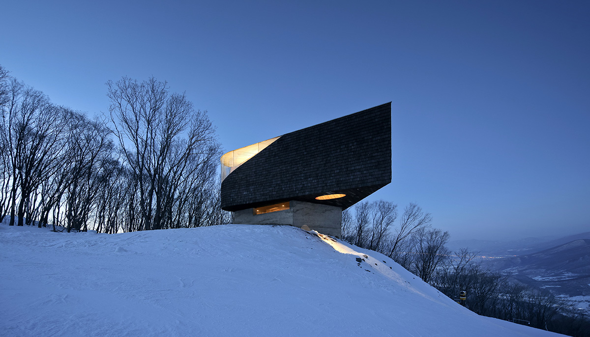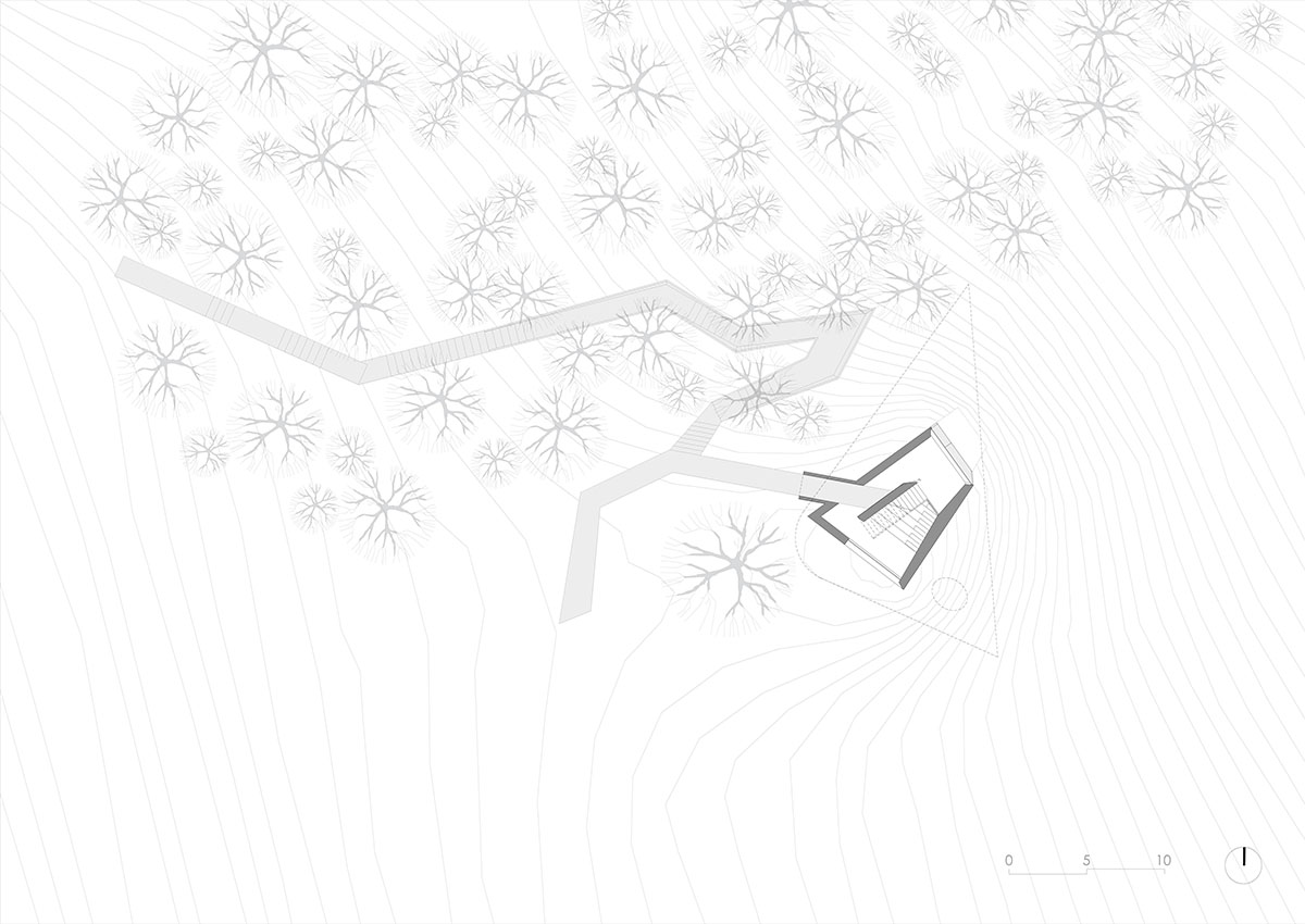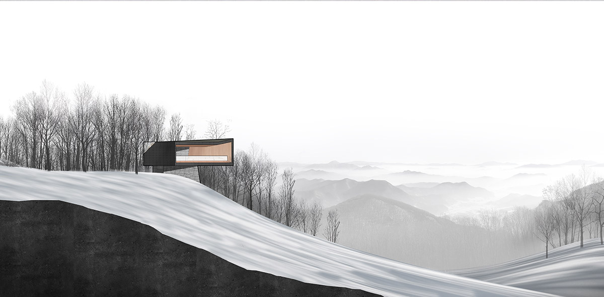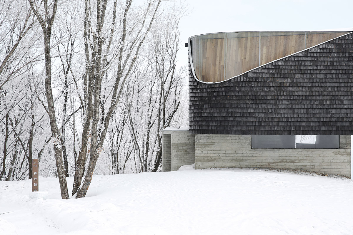 Situated on a hillside between the forest and the slope, the site is surrounded by luscious greenery in summer and covered by an overwhelming white snow in winter, stated the studio. "As is a delicate site for a “Land(scape) Mark”, one whose indefinite programming demands a careful degree of deliberation."