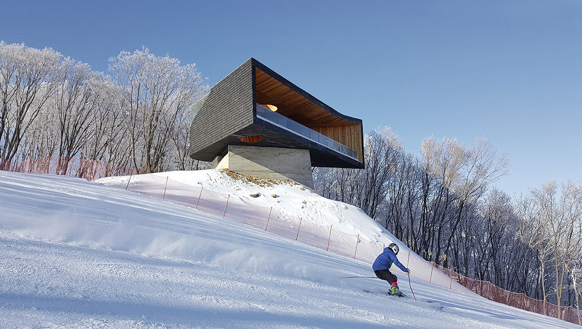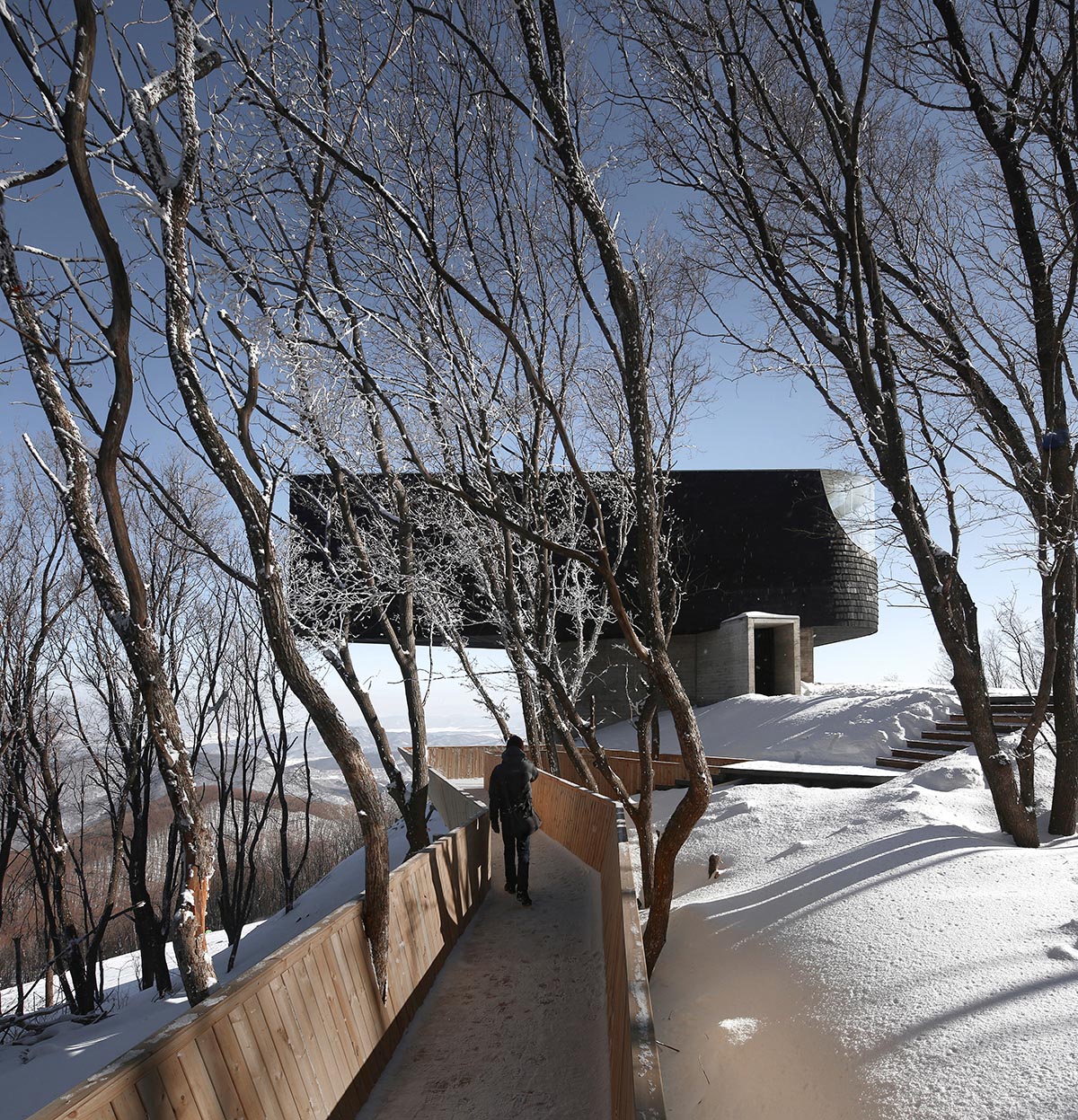 A triangular-shaped monolithic viewing platform raised above the ground is not just designed to look-out Chinese undulating landspace, but also provide a flexible public space for ski-lovers and travellers situated at Songhua Lake Resort in Ji Lin, China.
