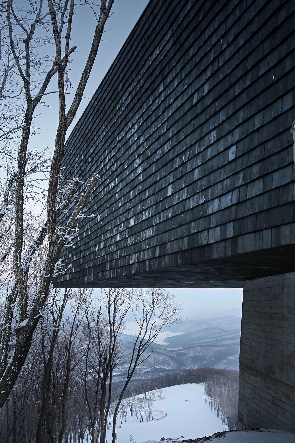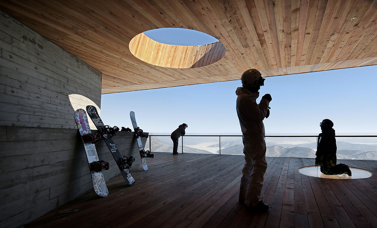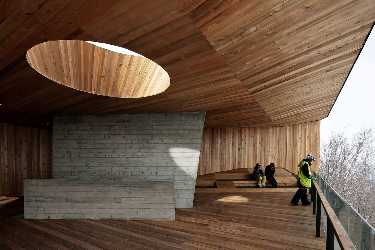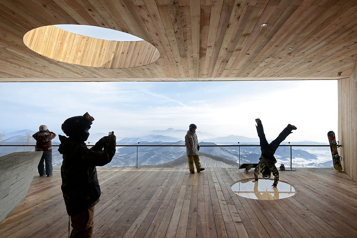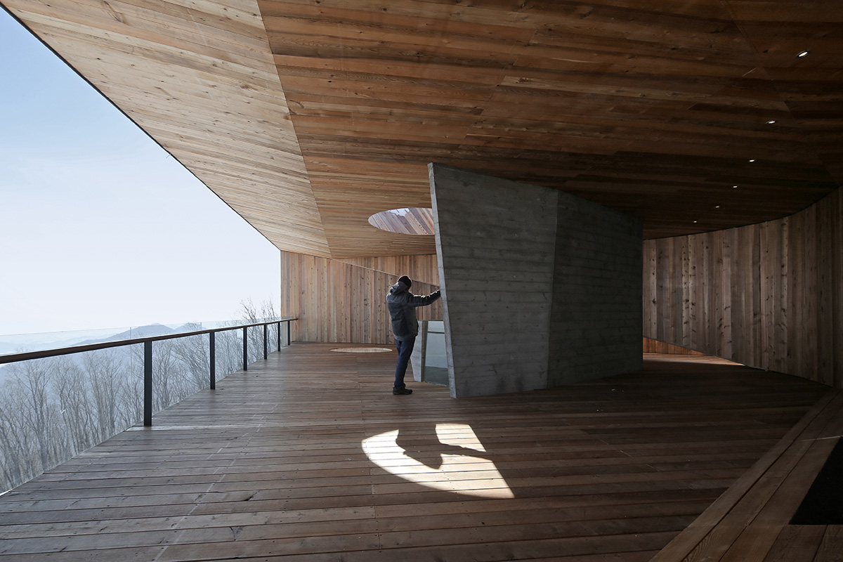 Not only it doesn’t obstruct the view to the lake and mountains, it even enhances the experience by inducing ever-changing tension between the cantilever and the surrounding landscape. The entire “stage” is like growing out from the mongolian oak forest, and cantilevering on top of the ski-slope.