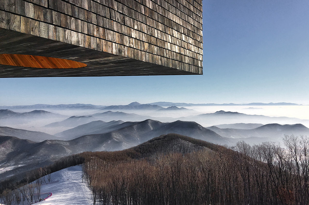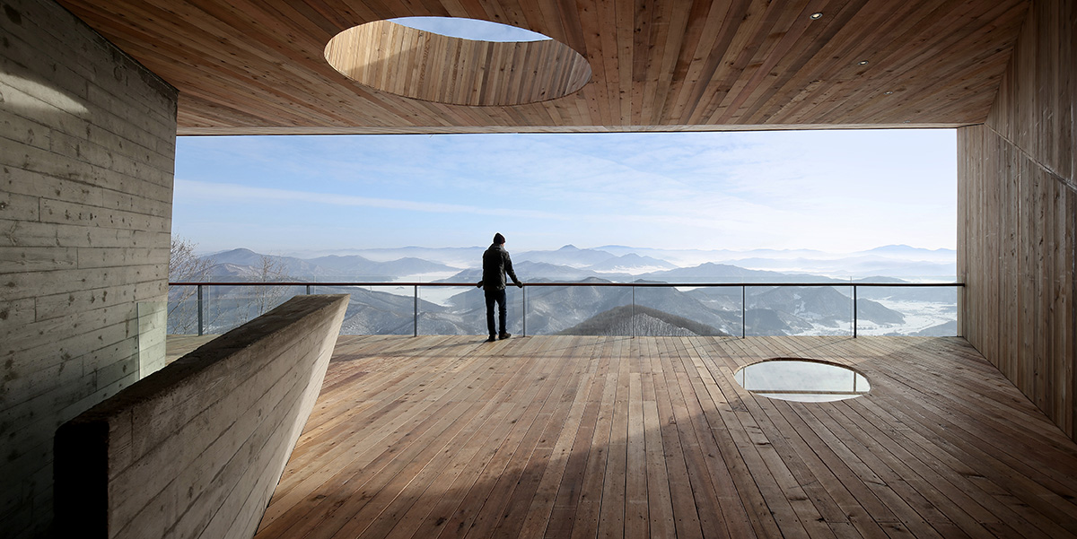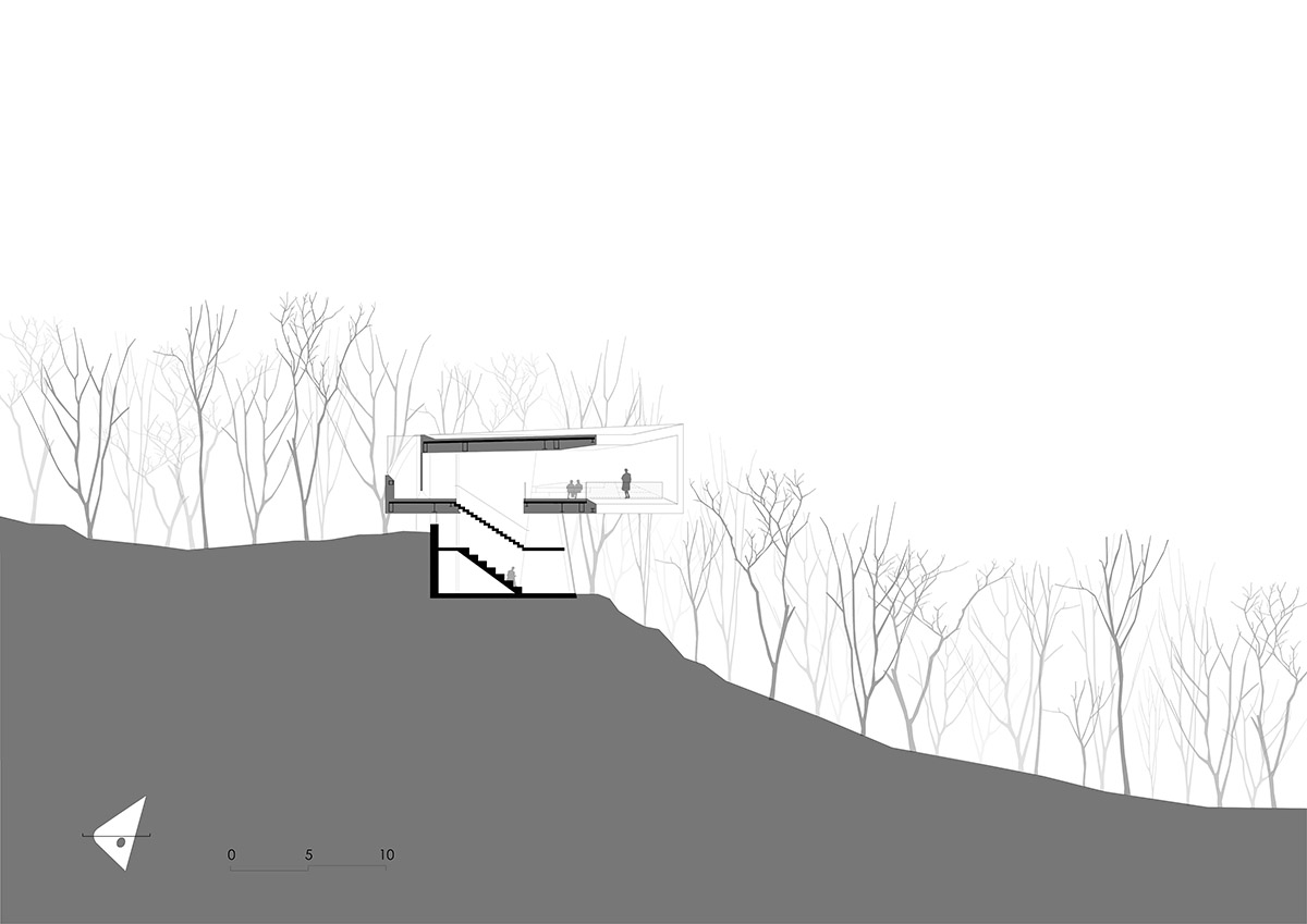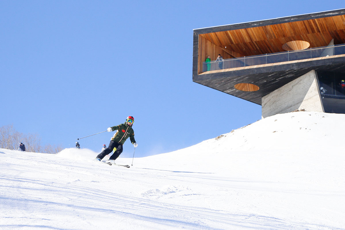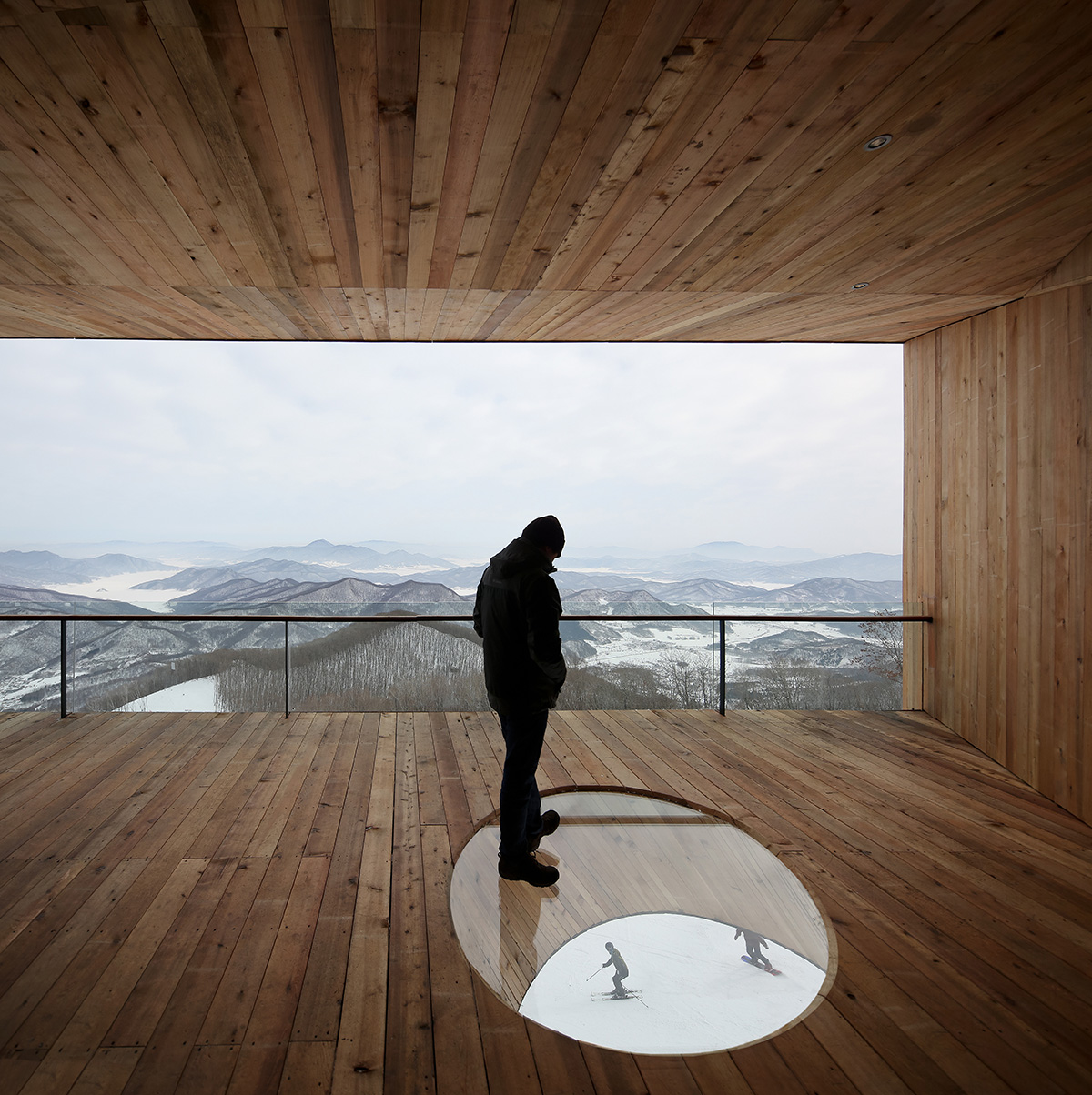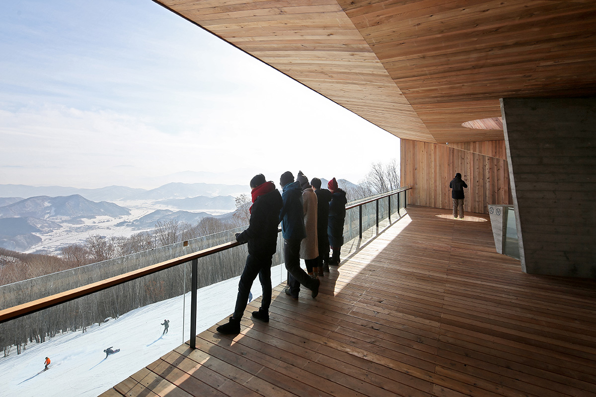 Not only it doesn’t obstruct the view to the lake and mountains, it even enhances the experience by inducing ever-changing tension between the cantilever and the surrounding landscape. The entire “stage” is like growing out from the mongolian oak forest, and cantilevering on top of the ski-slope.