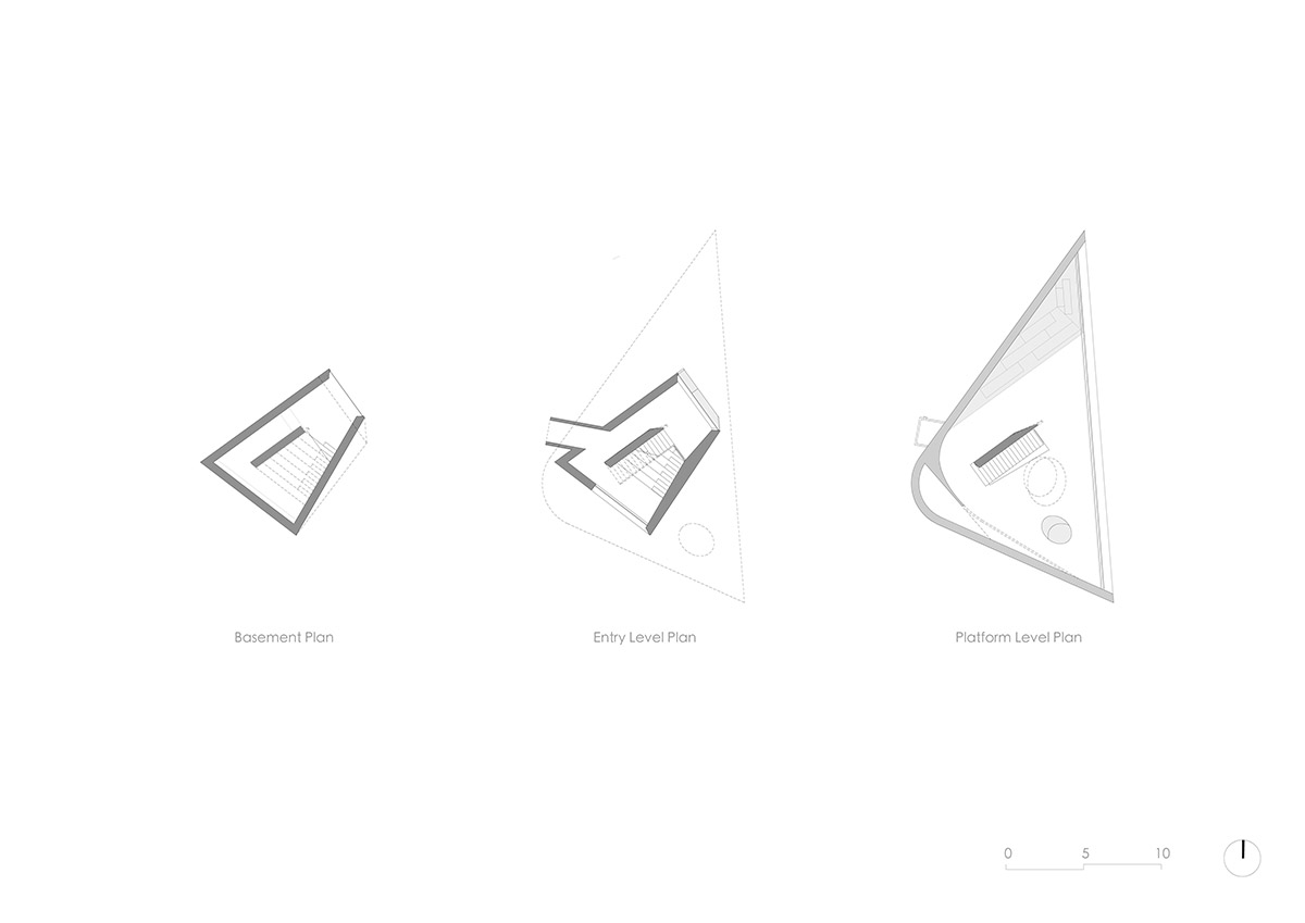 "As one descends from the mountain top, the “Stage” rises slowly above the undulating landscape, in a way like a piece of leaf floating on the water. Positioned with the 2 side-line along the approaching eyesight of the visitors from two routes: the trail in the woods and the ski-slope."