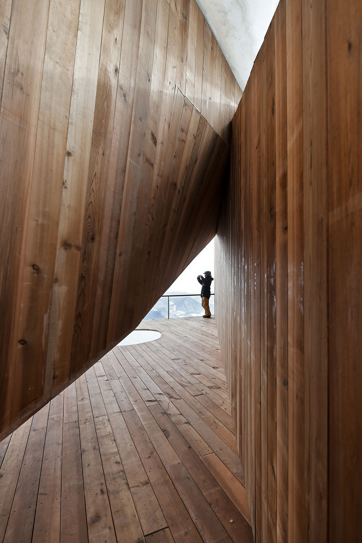 Because the orientation of the distant view (horizontal unfolding lake), and the close view (vertical extending slope) is at a different angle, the building results in a twisted gesture between the wood “stage” and the concrete “base”.