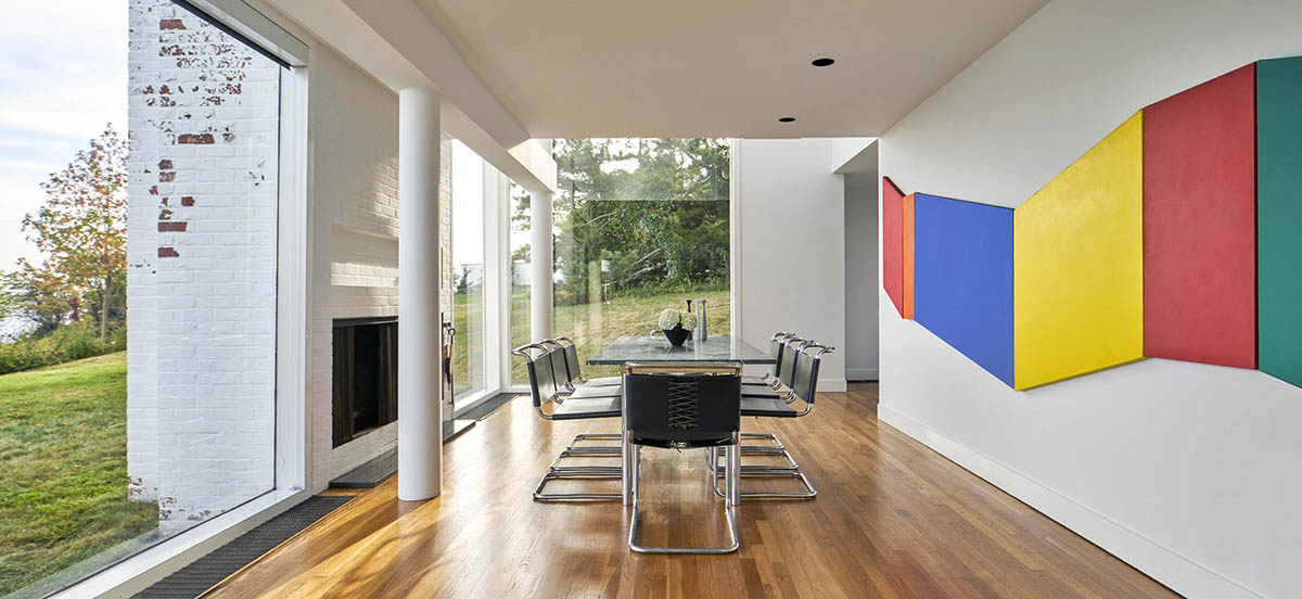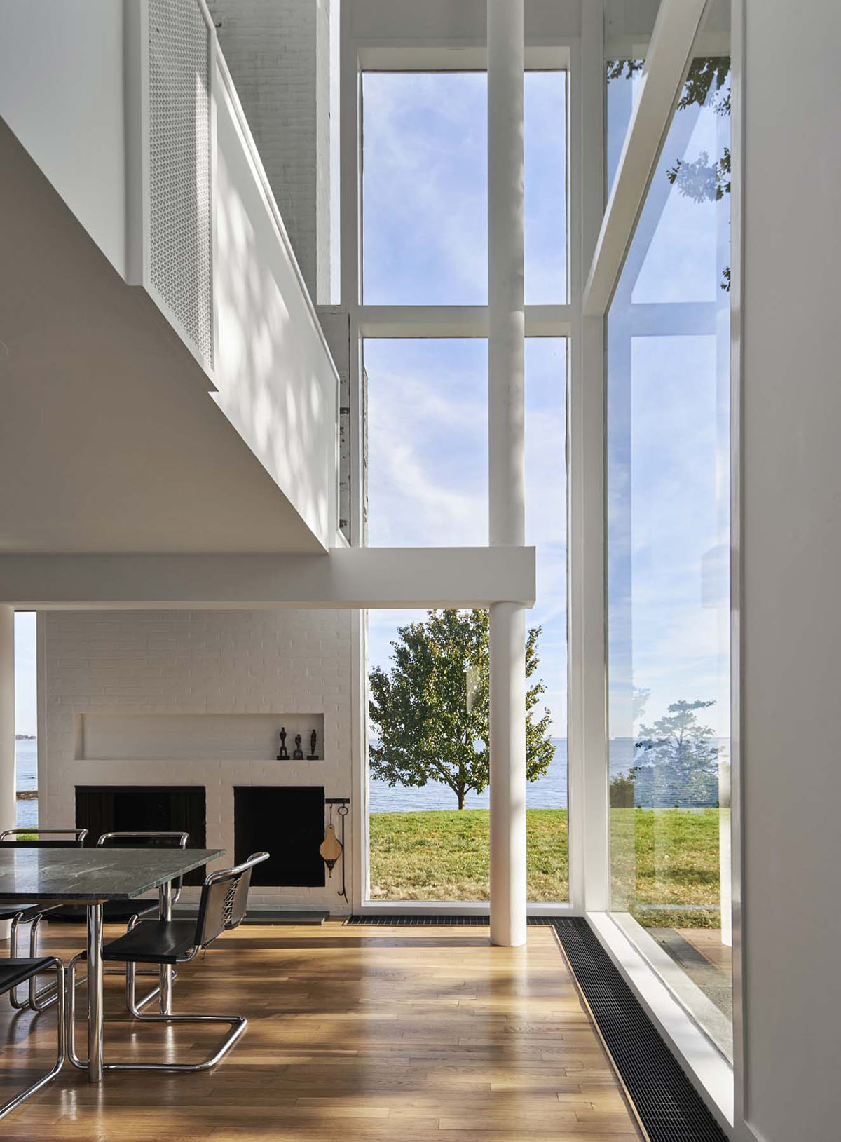 The dramatic view of sea and sky that greets one upon entering is framed and intensified in the transparent skin of the rear facade. Placed directly opposite the entry, a painted brick fireplace pushes to the outside through the tight frame of mullions.