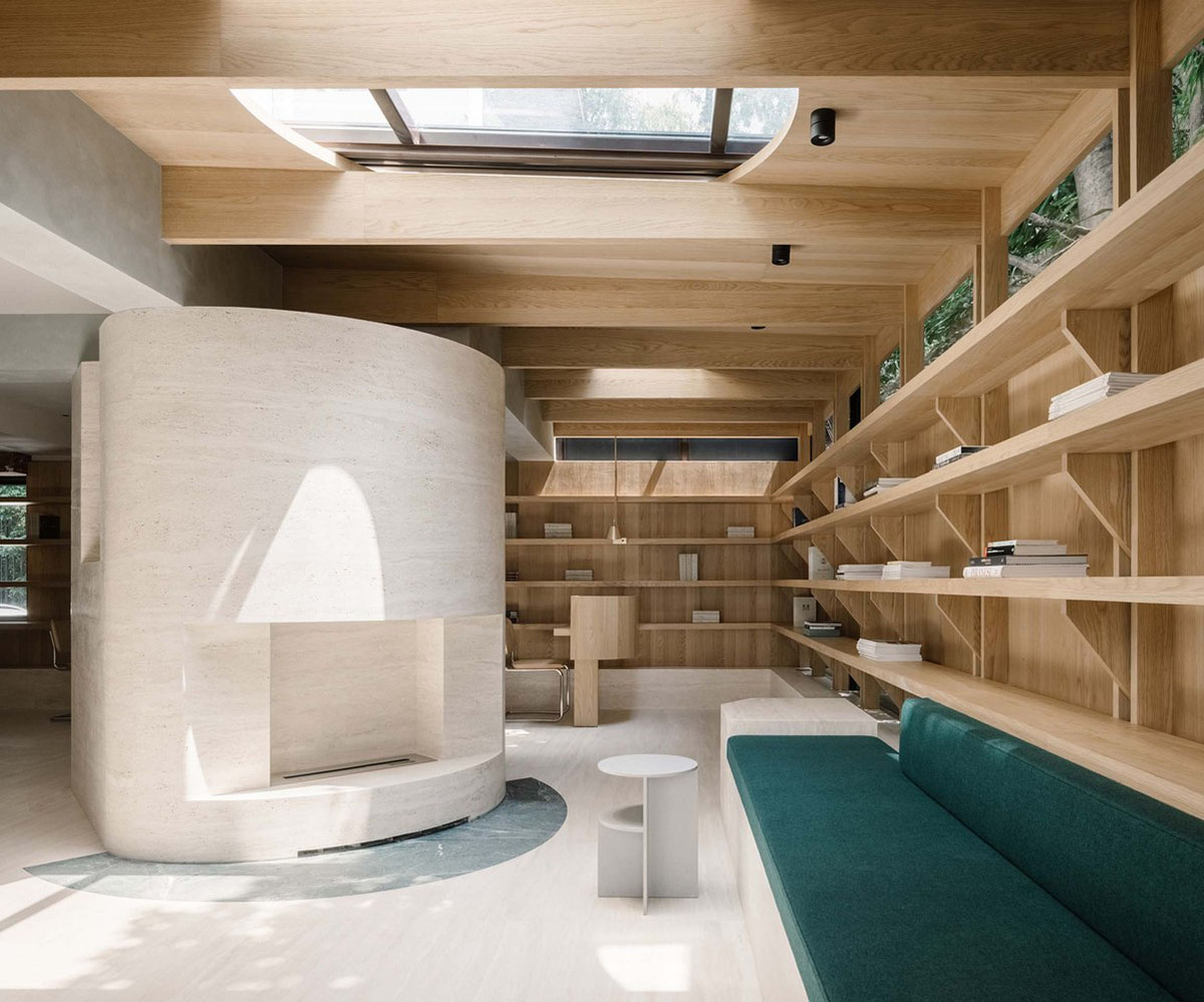 The team wraps them in off-white travertine in accordance with the irregular shape and transforms them into essential elements that act like a freestanding sculpture in the space.