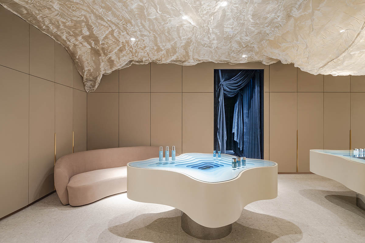In contrast to the surrounding sandy tones, the layered, water-like forms on the surfaces evoke the tranquil ripples of a desert pool. In addition to enhancing the space's visual depth, this juxtaposition symbolizes the peaceful coexistence of water and desert—a tranquil oasis amidst the endless dunes.